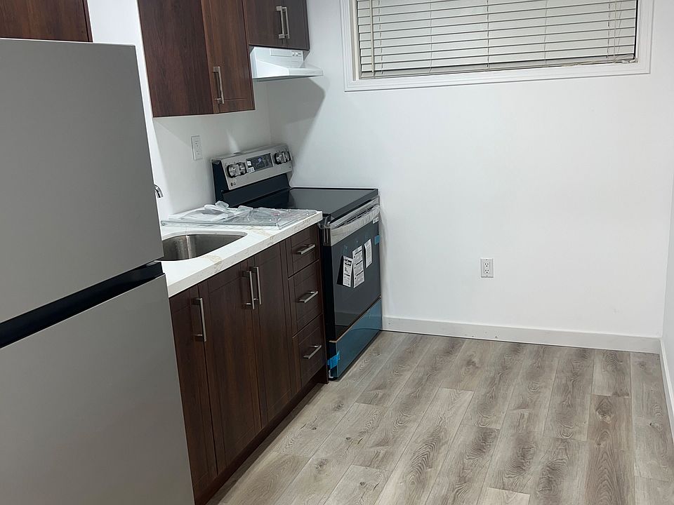 Newly renovated 1-bedroom basement apartment with shared laundry. Features brand new modern bathroom, kitchen and new laminate flooring throughout. Conveniently located near schools, parks, shopping, and transit. Shared entrance/foyer. Upstairs unit has a private locked door at the top of the stairs, and the basement unit has a private locked door down the stairs. Both units are completely private and secure. (No Parking).