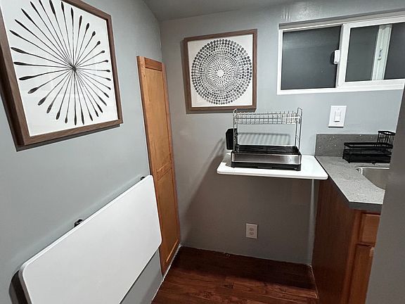 Private entrance very quiet! Full brand new kitchenette with new stainless steel fridge and microwave. THIS UNIT COMES WITH A KITCHENETTE BUT THERE IS NO COOKING IN THIS UNIT OTHER THAN USE OF A MICROWAVE. There is a stainless steel sink with garbage disposal.