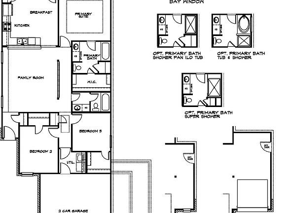 The Sweetwater plan is a one story home with 3 bedrooms, 2 baths, kitchen open to family room, and breakfast area. Optional bay window at primary bedroom, primary bath options, and covered patio available.