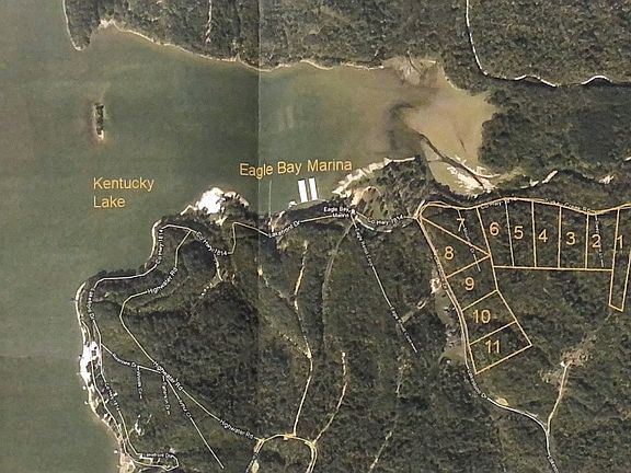 LAKE + CREEK FRONT ACREAGE on Kentucky Lake. !!!!!ATTENTION DEVELOPERS!!!!! 82.44 acres ALREADY surveyed and divided into 11, 5-acre tracks. Creek borders property. Unrestricted land. TVA property located across street. Located near FULL SERVICE MARINA: Eagle Bay Marina. NEAR PUBLIC BOAT RAMP & PUBLIC BEACH. Approx.1 mile of road frontage. Phone and Fiber Internet available. SCENIC VIEWS ON PROPERTY. RARE LISTING.