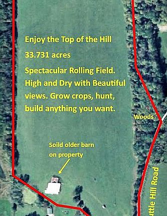 Tuttle Hill Road and Dewey Road. Town of Candor. Top of the Hill! 33.731 acres. Terrific rolling field with great views. Older solid barn on property. 30 acres of tillable field and 3 acres of woods. Recent Survey completed. Property is made up of 2 lots. Financing is available with $10,000 down.