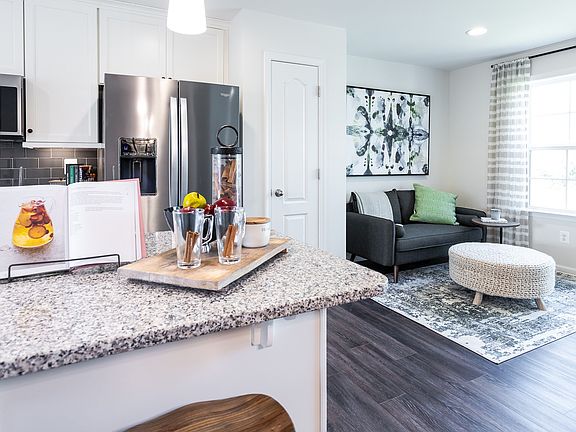 End of Row, Spacious Garage Townhome with 3 Finished Levels! This beautiful York II, townhome offers 3 bedrooms, 3.5 bathroom, and luxury vinyl plank flooring throughout the 1st floor. The well-appointed kitchen features stainless steel Whirlpool appliances, upgraded Willow mission style cabinet, white Quartz countertops, pendant lighting, and large island that overlooks the adjoining dining area. The primary suite features a generous walk-in closet and an en suite bathroom with dual sink vanity and 5 ft. walk-in shower. Two secondary bedrooms, a full bath and a conveniently located laundry area complete the second floor. The lower level features a finished recreation room and full bathroom. There is minimal outdoor upkeep with lawn care and trash pick-up included in the HOA fee.
