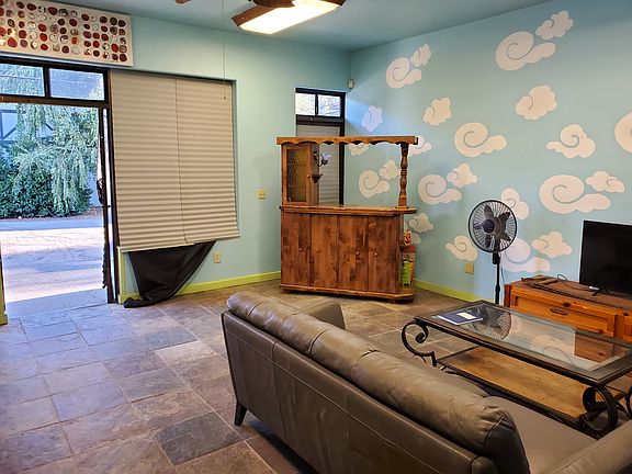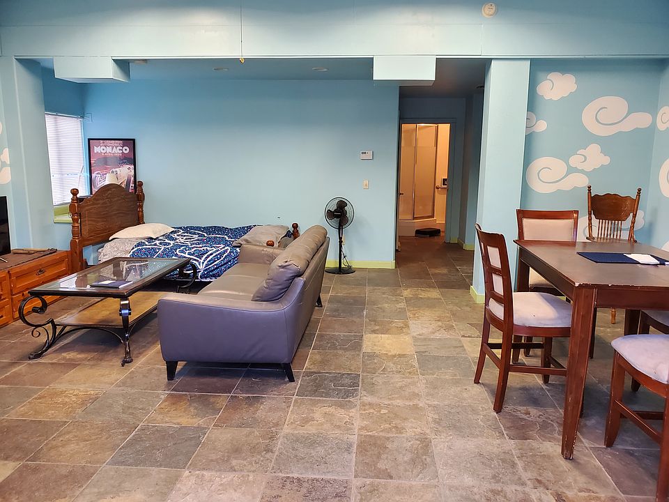Spacious, level-entry studio apartment with slate-tile floors throughout and an extra room with a kitchenette.
