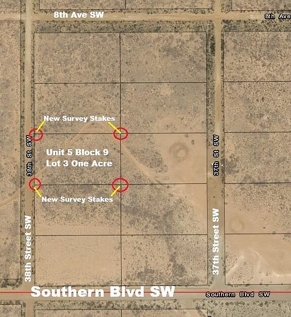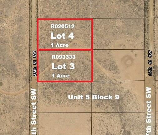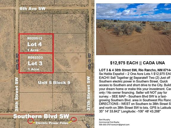 $12,975 EACH! - Two (2) One Acre Lots /\ Electric power very close. Sell Together or Separate!! Just off Southern electric power in Southern Street. Quick access to Southern and short drive to the City. Build your dream home or make this your investment. Se Habla Espanol - Cash only / No owner financing. Southern Blvd SW is a fast-growing Southern Blvd. area in Southwest Rio Rancho. Directions - West on Southern to 38th Street SW north to lot. GPS is Latitude: 35 14' 33.842''Longitude: -106 48' 43.268''