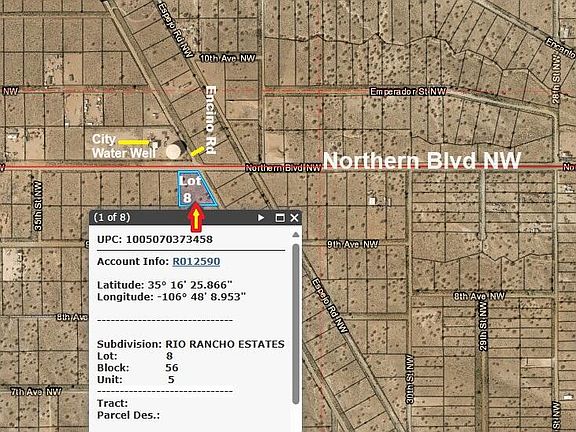 Great Lot!! Electric Power on Lot!!! 1.45 Acres. SW Corner of Northern Blvd and Encino Road NW. Huge views! City water well & tank across the street. Seller has no information on access to any utilities. Call for further information. Thank you.