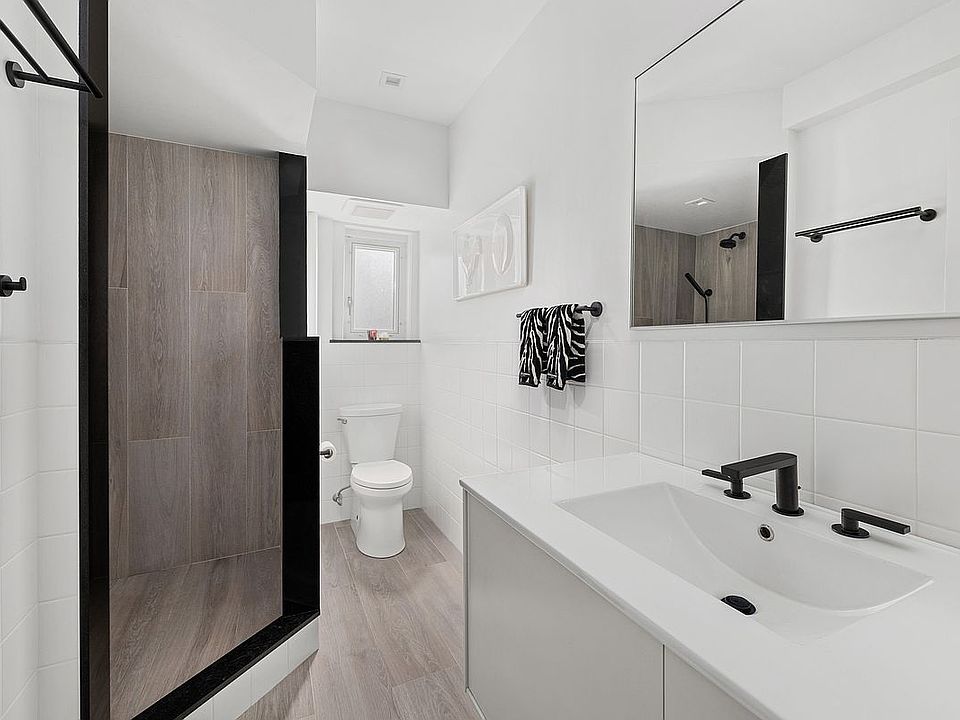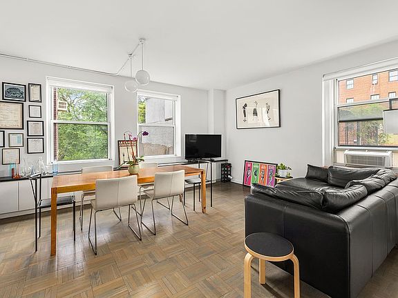 With three exposures, the home is flooded with natural light throughout the day and offers seasonal views of the Empire State Building and tree canopy. The modern open floor plan is ideal for both relaxing and entertaining, anchored by a sleek, renovated kitchen featuring stainless steel appliances, a stylish mix of wood and white cabinetry, and a tile backsplash.