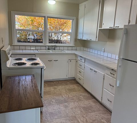 Bright kitchenPractical layoutRefrigerator stove and dishwasherGas wall heater