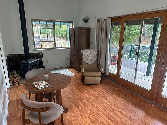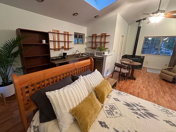 With a beautiful view of the pond, this cozy, partially furnished stand-alone studio offers a serene retreat, perfect for one individual. Just 15 minutes away from downtown, it features a 3/4 bath with a toilet, sink, stand-up shower (no tub), kitchenette with refrigerator, ice-maker, a wood stove, plus additional heating and AC for year-round comfort. Hardwood floors. Step outside your front deck to a bistro table set. Enjoy a lovely garden and a spacious patio area perfect for relaxation. You have a dedicated parking spot. You also have an on -site washer and dryer. All utilities are included plus Starlink internet for added convenience. Easy access via a county maintained gravel road to downtown. This peaceful setting is a balance between nature and city- ideal for anyone looking for a tranquil and comfortable space. No pets, please.