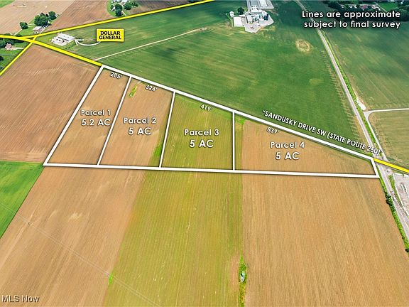 Live Auction 11/15/25 11:00 AM - Parcel 2: 5 Acres w/ 324’ frontage - An attractive 20.2 acres nestled in the Beach City area offering excellent flat development style ground perfect for building, farming, or subdivision. The land has been farmed and offers productive tillable farm fields and has excellent visibility and accessibility on US RT 250 perfect for home sites or commercial usage. These 5-acre parcels provide easy access in all directions and provide a multitude of possibilities for all buyers in the market for vacant land. Please contact agent for a showing or before walking the land.