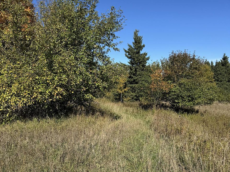 " Food Sources: Abundant apple trees are scattered throughout, providing a natural, high-value food source that deer can't resist, complemented by a mix of young and old aspen stands.