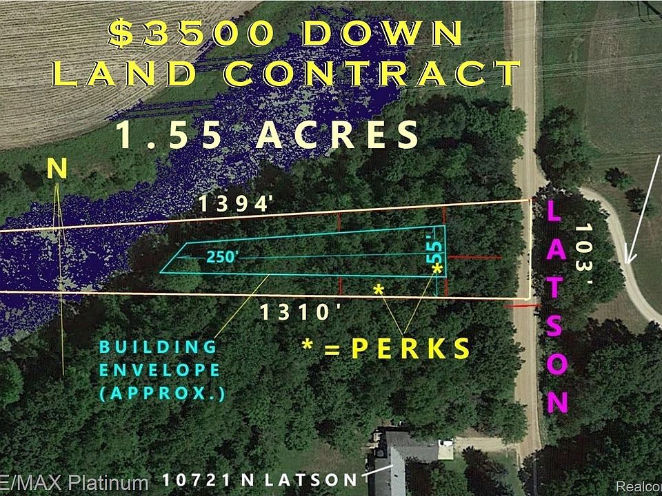 PERK , SURVEY, BUILDING ENVELOPE IS ALL STAKED OUT AND WELL MARKED. BUILDING ENVELOPE SKETCH, AND DRIVEWAY SIGHT DISTANCE REVIEW IN DOCS.PARCEL IS A LONG TRIANGLE BUT HAS A GOOD BUILDING SITE. HOWELL SCHOOLS OR SCHOOLS OF CHOICE ( BYRON, LINDEN, FENTON, HARTLAND BUSES NEARBY. VERY CLOSE TO OAK GROVE STATE GAME AREA (2453 ACRES). EASY LAND CONTRACT. SELLER IS LICENSED REAL ESTATE BROKER. ZONING A-1 GENERAL AGRICULTURE DISTRICT. BUILDING ENVELOPE SKETCH SHOWS PLENTY OF ROOM FOR HOME AND BARN. QUIET RURAL AND SCENIC. SUBJECT TO APPROVAL OF PURCHASER'S CREDIT REPORT.