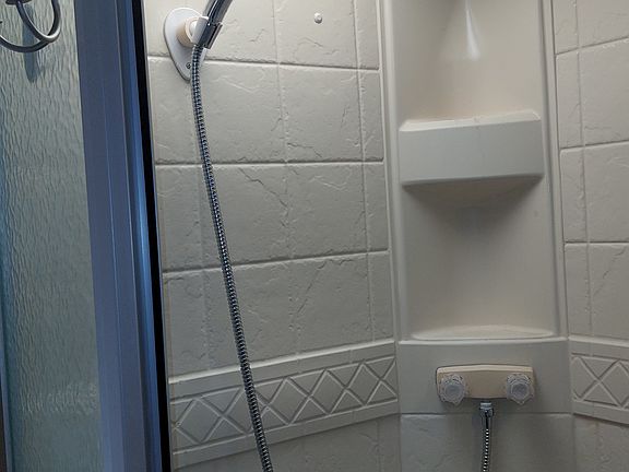 The shower dispenser inside has shampoo, conditioner and body wash.