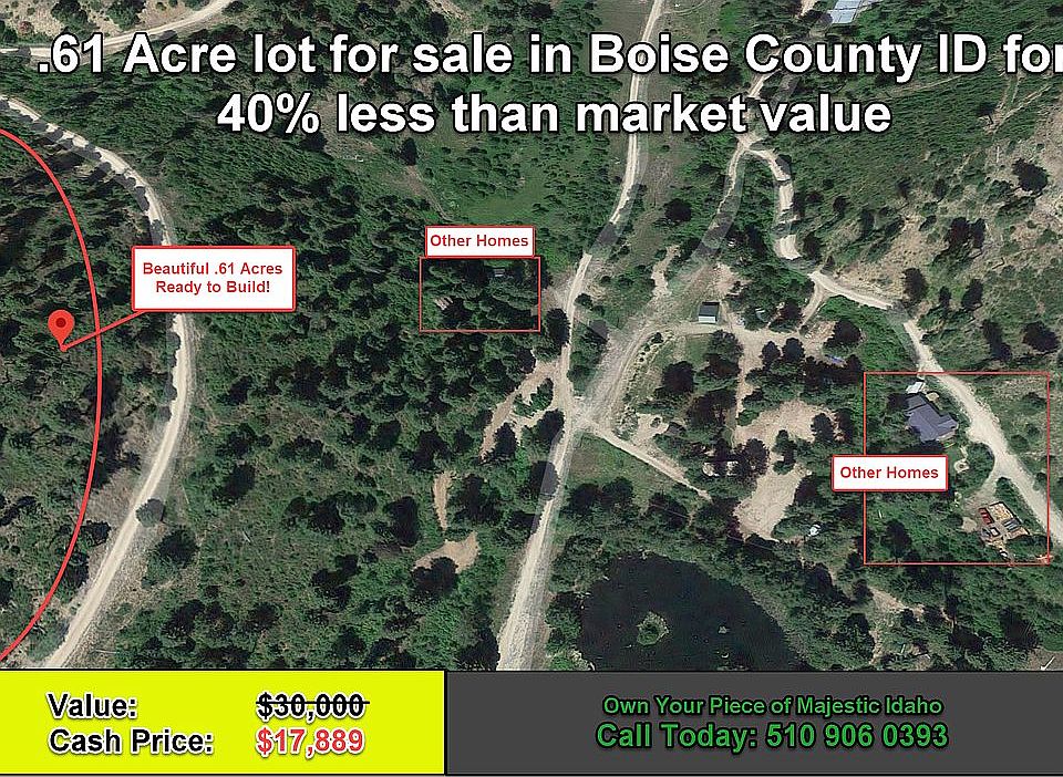 Save over $12K on Majestic Mountain Getaway Amazing .61 AC property valued at $30K can be yours today for $17,889 Don't miss your shot to buy this amazing .61 AC property valued at over ($30,000) At a deeply discounted purchase price of as little as $17,889 This piece of land in a serene and secluded area of Boise county is perfectly priced to move, so act quickly. This lot is a great site for a weekend getaway or to build a seasonal recreation cabin. This is heaven all-year round for an outdoorsy nature enthusiast. You are minutes away from hot springs, hiking trails, rafting, cross country skiing, and snowmobile highways just to name a few things. Market Value: Slightly smaller properties in the area (.53 acres) have recently sold at $35K in June 2020. And many other comparable lots in the area are listed and continue to sell between $25K and $40K. Own your property NOW for only $17,889! (Saving you over $12,111 or 40%) This is your chance to own your piece of paradise, ACT FAST! Call us Now @ 510 906 0393 Buy this property today for just $17,889 Interested? Call or txt Oko Eko @ (510) 906-0393 Property Type: Land Sale Price: $17,889 State: ID County: Boise APN (Assessor's Parcel Number): RP021030020030 Property Address: 44.059, -115.514 City: Lowman Zip: 83637 Size: 0.61 Acre(s) Zoning: Rural Residential Subdivisions Road Access: Yes - Unpaved Electricity: Yes Annual Taxes: $72 Market Value: Similar lots in the area are selling for $30,000. Get this property now for $12,111 below market value... Own it today for just $17,889 Don't have the cash? We also offer owner financing -- no credit checks required! To buy this property at this discount price call or txt Oko Eko @ (510) 906-0393 Don't miss out on this great deal call or txt us now!