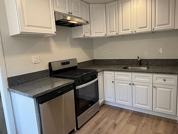 The NEW eat in kitchen features beautiful granite counters, hardwood floors, spacious white cabinets and all new Stainless Steel appliances: Fridge, Dishwasher & Gas Stove & Oven. Lovely space to cook and relax or enjoy your own window seating nook looking out to your side garden with orange trees.