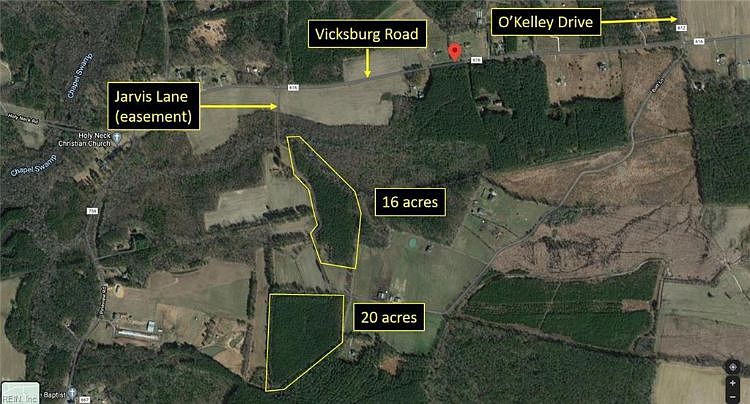 GREAT INVESTMENT OPPORTUNITY. + - 36.35 PRIVATE ACRES IN TWO (2) NON-CONTIGUOUS PARCELS; 20 and 16 ACRES. BEING SOLD BY THE GROSS, NOT BY THE ACRE. SURVEY AVAILABLE. LAND WAS TIMBERED 2 YEARS AGO AND PROFESSIONALLY PLANTED WITH LOBLOLLY PINE IN JANUARY. DEER, BEAR AND TURKEY ABOUND THROUGHOUT THE PROPERTY AND NEIGHBORING FARMS. VERY QUIET AND PEACEFUL YET ONLY 20 MINUTES AWAY FROM THE HEART OF SUFFOLK. COME VISIT AND SEE YOUR FUTURE FOREVER HOME SITE. CALL THE AGENT WITH ANY QUESTIONS.