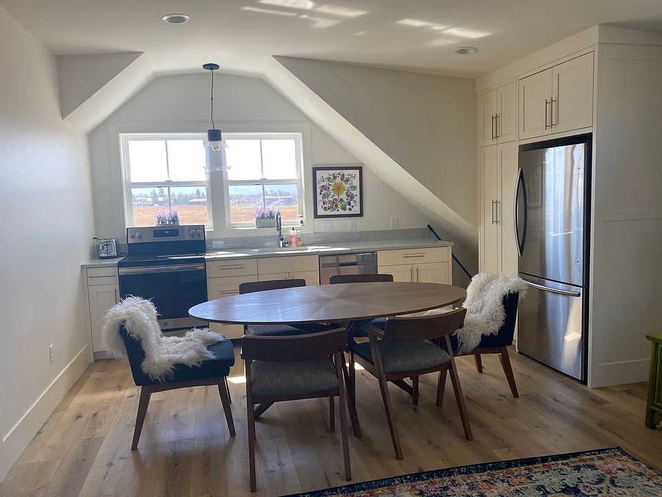 Full Modern Kitchen and Bath. This studio is a separate entrance and is located above the garage. Storage for skis, bikes and smaller recreational equipment in the garage. Parking for 1-2 cars. Modern farmhouse, newer construction on a well kept lot, 2.5 acres with a shared back yard space. Homeowner lives on site in the main house with family. Quiet neighborhood with equidistant access to skiing and recreation in Teton Valley and Jackson Hole.