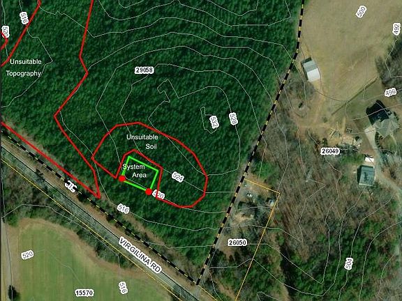 Beautiful 87.39-acre property in Halifax County, VA, offering approximately 1,200 feet of road frontage on Virgilina Road. Zoned Agricultural (A-1), providing flexibility for residential, recreational, farming, or investment opportunities. A new survey has been completed and property lines are clearly marked. Site and soil evaluation performed in accordance with Virginia's onsite wastewater regulations. Red clay loam soils, extending 48–60 inches deep, are suitable for a 3-bedroom conventional septic system. The land features 66.2 acres of evergreen forest, 15.26 acres of mixed forest, 2.29 acres of open space, 0.57 acres of pasture or hay, and 0.38 acres of shrub and scrub. This versatile tract combines wooded privacy with open areas ideal for homesites, recreation, or timber management. Conveniently located near South Boston (20 mi), Clarksville (22 mi), and Durham, NC (58 mi). A rare opportunity to own a large, well-prepared parcel in scenic southern Virginia! Please enjoy looking around responsibly. This is unimproved land — surfaces may be uneven. Entry at your own risk. The owner and Pointe Realty Group are not responsible for accidents or injuries.