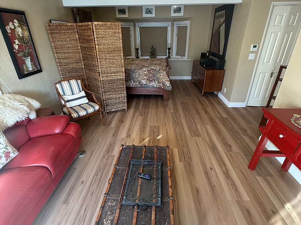 You share an acre of land with the owner of the main house. This is a very peaceful, quiet neighborhood, so no partiers or lots of people coming in and out.