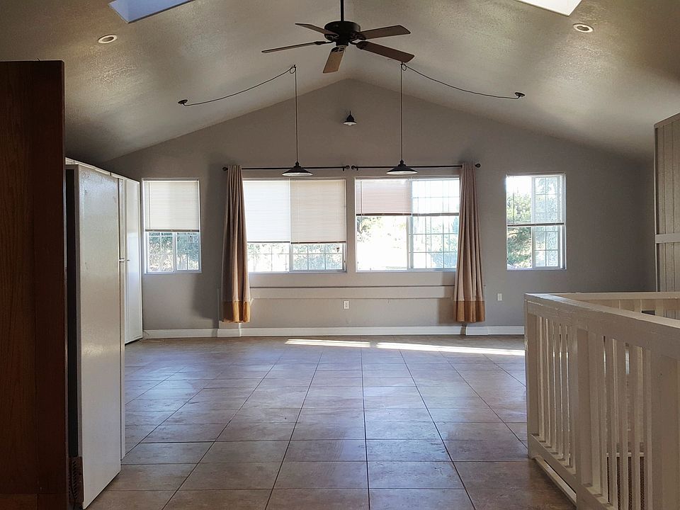 Upstairs space- open great room, high ceiling, lots of natural light from windows and skylights, ceiling fans
