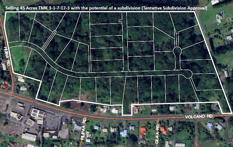 Rare development opportunity! 45 Acres on Huina Road, Kurtistown, Hawai‘i with Tentative Subdivision Approval for 40 one-acre lots! Current developer modeling lot to emulate beautiful local subdivisions such as Keaau Agriculture Lots and Ola Hou Estates.<br><br>Entitlement, Legal, and Civil Engineering work is well underway, positioning the project beyond early risk and on a clear path to final subdivision approval.<br><br>Project Highlights:<br>• 45-acre lot with Tentative Subdivision Approval from Hawai‘i County that is a short drive off the highway<br>• Property to be divided into 40 one-acre lots (some larger) with County Water allocations secured through May 2026<br>• Minutes from Hilo, Kamehameha Schools, restaurants, Kea’au Shopping Center and the airport<br>• HELCO power and high-speed internet available in the area<br>• Potential for Mauna Kea Views!<br><br>Work Completed and In Progress Toward Final Approval:<br>• Use and Occupancy approval has been granted to bring a waterline onto the property<br>• A required stoplight at Huina Road on Highway 11 is already installed per approval requirements<br>• Topography has been completed after more than a year of work<br>• Okahara Engineering & Associates began the civil engineering in 2024<br>• Carlsmith Ball, LLP retained in early 2024 to manage DCCA registration and legal work<br>• CCRs + HOA docs have been prepared, ready for DCCA filing<br>• Final subdivision map with county revisions is nearing approval<br><br>Video: https://www.canva.com/design/DAG1_v-AIas/le50TcZdt2F6604fFk9KDg/watch?utm_content=DAG1_v-AIas&utm_campaign=designshare&utm_medium=link2&utm_source=uniquelinks&utlId=hc58ad81c44<br><br>New owner will need to bring a larger county water pipe across the highway, the UOA approval for which has been granted. Offered for sale is one 45 acre lot. No presales or individual lot sales are available at this time. Buyer to verify subdivision feasibility. MLS 720096 TMK 3-1-7-17-3