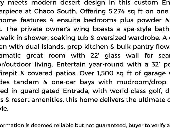 Luxury meets modern desert living in this custom Entrada masterpiece at Chaco South. Featuring 5,274 sq ft on one level, the home offers two private primary suites plus two additional ensuite bedrooms, powder & pool baths. The chef's kitchen with dual islands, prep kitchen & bulk pantry opens to a dramatic great room with 22' glass wall for seamless indoor/outdoor living. Entertain with a 32' pool, 7' spa, firepit & covered patios. Over 1,500 sq ft of garage space with tandem & single bays. Located in guard-gated Entrada with world-class golf, dining, fitness & resort amenities.