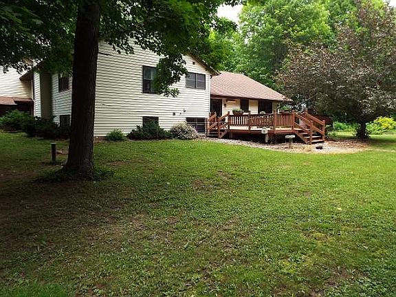 This is a beautiful Tri-Level home with 3 bedrooms and 4 baths. A whirlpool tub, custom built solid oak bar, master bedroom with 2 master walk-in closets. Large yard beautifully landscaped, deck,and outbuilding. 2 and a half car heated garage. Located in a quiet rural setting on 13 wooded acres. Golf and recreation nearby. Don't miss out on this one.