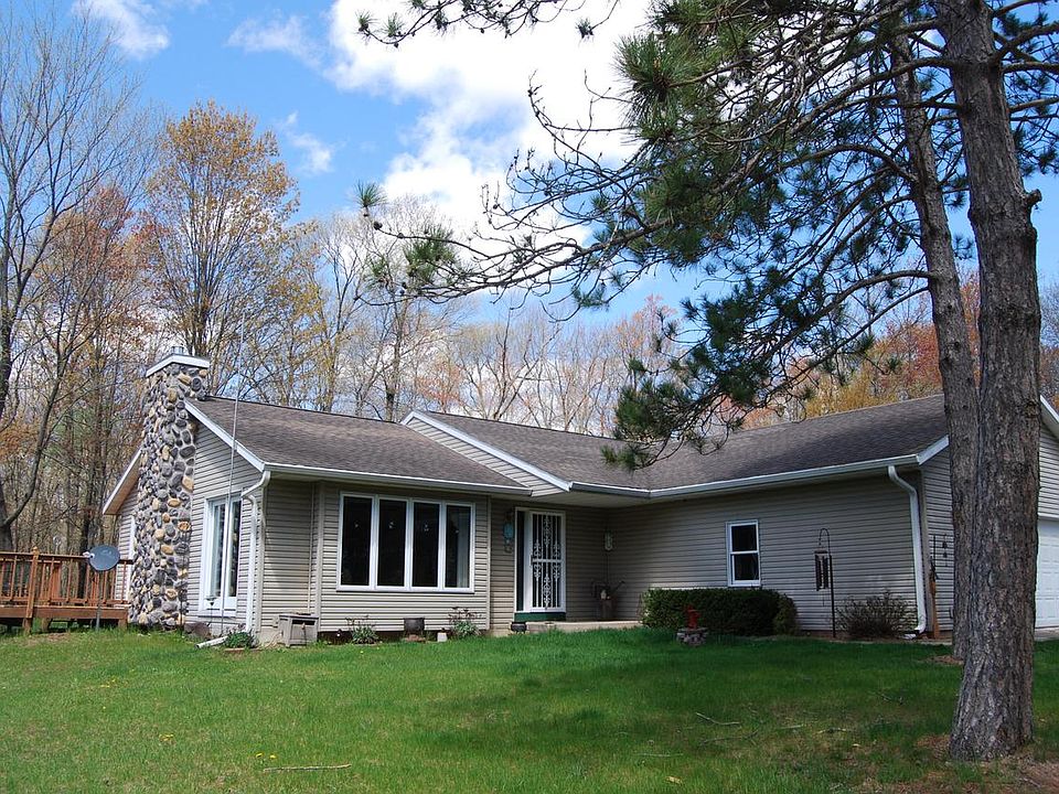 RARE OFFERING IN THE NORTH WOODS! Private, heavily wooded 20 acres nestles charming ranch with custom built outside sauna building, additional detached garage 18x26 and pole building 20x30...tons of space for workshop, hobbies or toys. Bright home features living room gas fireplace, vaulted ceiling, multitude of windows, patio doors off dining to entertaining deck, breakfast bar in kitchen with all appliances included. Large Master suite includes WIC, and full bath with shower stall. Main level laundry, hall pantry, storage space galore.