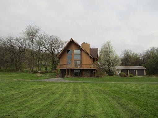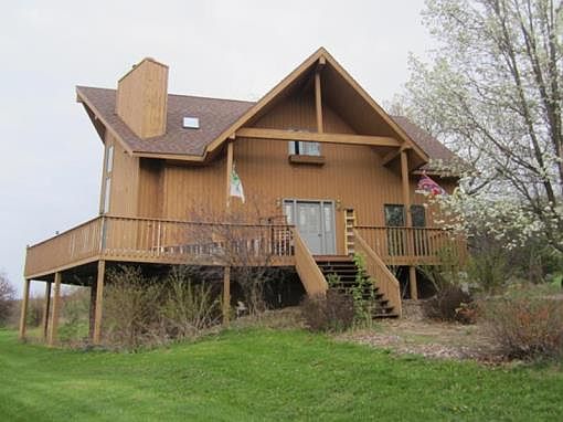 High on a hill with a Million Dollar view and 55.91+/- acres sits a home in the Caledonia hills. This 3 BR, 3 BA home with a wall of windows, skylights, a large wrap around deck, a bonus area on the second floor with a fantastic view, a large open kitchen and lots of storage. There is a large (30x48) Wick heated workshop and a (24x40) 3 car garage. Wildlife abounds on this property. Close to interstate, Wisconsin Dells and just 30 minutes from Madison. Make this your relaxation haven!