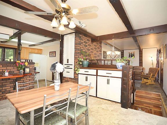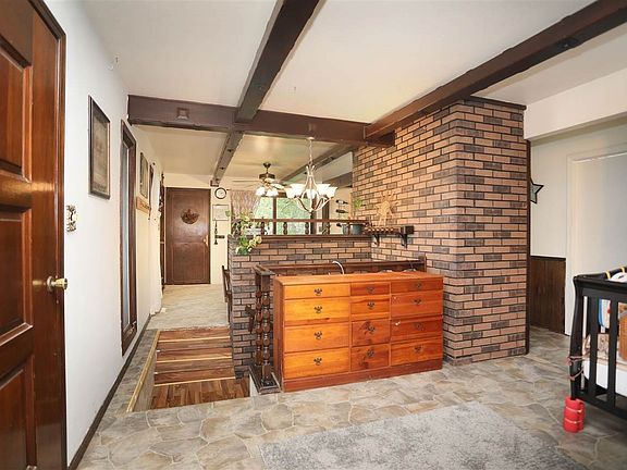 Country Living! Character throughout the home. Living room with wood beams flow into the eat in kitchen. Generous amount of cabinets, dining area with patio door and entry to the garage. Master suite with double closets and private full bath. Two large bedrooms and full bath complete this level. Open staircase leading to finished walk out lower level with family room featuring a wood-burning fireplace, and additional flex room. An abundance of nature with this 2+/- acre lot with a stream running through it. 2 car attached garage for your convenience.