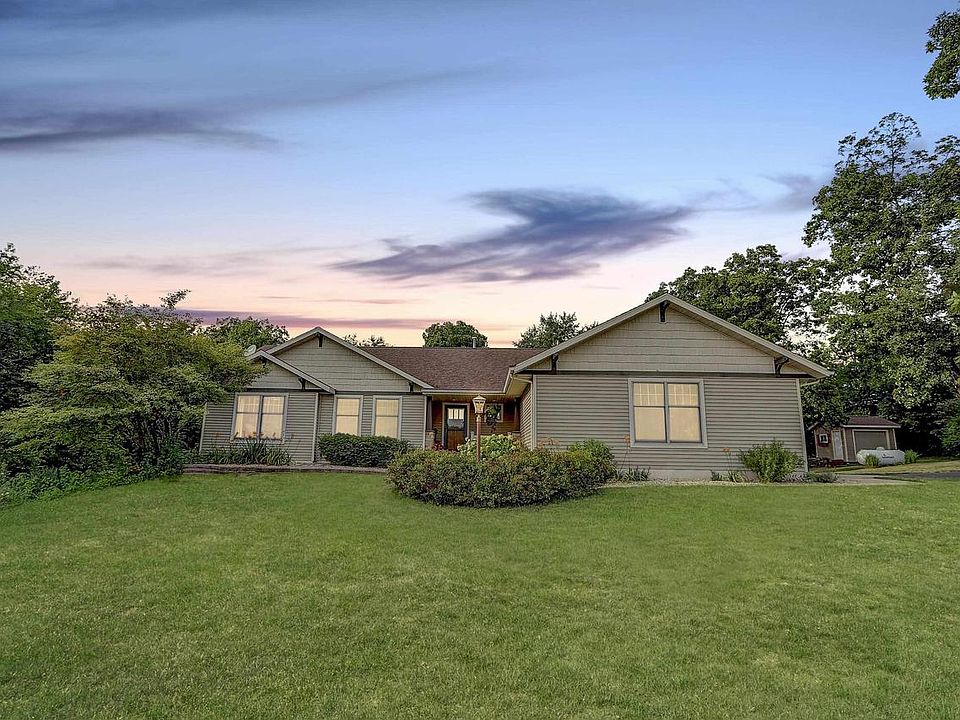 Located in a quiet country subdivision just 30 minutes from Verona & the Epic campus, and a short distance from the iconic Sugar River Trail, this custom build is a nature lover?s dream! From the 3 season porch you can take in the scenic views of over 5 acres of private walking trails, or enjoy the serene countryscape from the patio or fire pit area. The interior boasts a split bedroom design, including a large primary suite with a double vanity and whirlpool tub in addition to the private study. The kitchen not only has ample cabinet space, but a walk-in pantry, large island, and breakfast bar. Beautiful custom wood details, oversized windows, and gas fireplace make this a cozy and inviting space that you will love coming home to.
