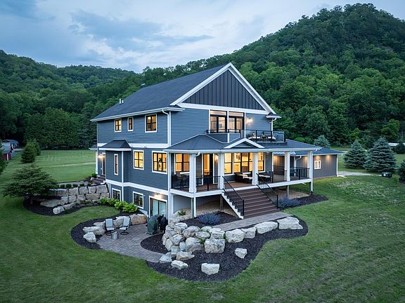 Exceptional property on 2.8 acres with panoramic Lake Pepin views, just outside the charming town of Stockholm! A rare opportunity to own and enjoy a truly beautiful homestead with awe-inspiring views from main and upper decks and numerous interior rooms. Step inside this luxurious home and you will immediately feel the warmth of the inviting interior and appreciate the location sitting on a hill overlooking the great Mississippi River. Enjoy not only the river side views but also the serene bluff side views from the covered porches and second floor deck. Many updates including new siding, mud room addition, large insulated/paneled 3 car garage with steel roof and heater/electric car hookups, custom blinds, new landscaping, new front and side doors, stacked laundry, new furnace and A/C and more. The main level boasts a great room with sliding barn doors and fireplace, kitchen, dining, ensuite bedroom with 3/4 bath and sliding doors to paver patio, 2nd bedroom with private sink area and walk-in closet, laundry room and a new mud room and side entry to garage. Upper level has numerous opportunities and is currently used as a primary bedroom suite with great room, full bath with separate shower and soaking tub, walk-in closets and another bedroom which could also be used as an office. This level is plumbed for a kitchen and washer/dryer. The walkout lower level is studded and ready to be finished and has a finished 3/4 bath with in-floor heat. This level also is plumbed for a kitchen and washer/dryer. Other features include walnut and tile flooring plus granite countertops throughout, a Kinetico water filter/reverse osmosis, inground sprinkler system plumbed in (not currently used), and ceiling fans and heater for bluff side porch. This dream home awaits your arrival! ADDITIONAL 1.55 ACRE LOT AND A WOODED 7.1 ACRE LOT for sale adjacent to this property!!