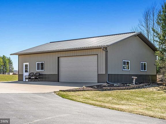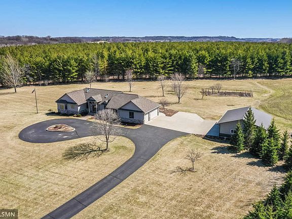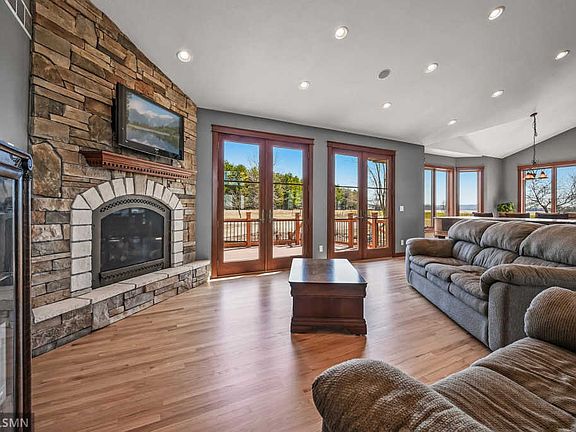 Gorgeous well maintained home in a private cul-de-sac setting on top of the hill with West facing panoramic views well into Minnesota. 4 bedroom & 4 bath home on over 6 acres of land. Main floor Owners Suite with private en-suite & walk in closet. 2nd bedroom on main level is next to the full bathroom. Open floor plan includes kitchen, dining & living room with gas fireplace & newly refinished hardwood floors. Large 8-ft high Andersen Windows French doors lead you out to the large no maintenance deck overlooking the perennial gardens with access to the backyard. The lower level is fully finished with 2 additional bedrooms & full bathroom & Andersen French Doors leading to the lower level patio & retaining wall gardens. Family room includes a wet bar with refrigerator, cooktop, dishwasher & bar height counter. A perfect space for entertaining & watching a game or movie. 3 car garage with access to lower level from garage plus a pole shed for additional storage for your toys & gear.