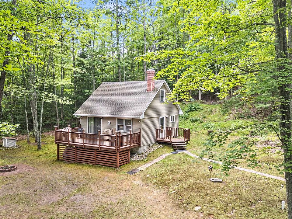 Pristine Cabin on a very private double 2.18 acre lot located centrally for recreation and entertainment. The Cabin features an inviting open concept with a wood burning fireplace to radiate heat throughout. Clean and simple you can enjoy the cabin or walk out to the beautiful attached deck. Upstairs is a partially finished sleeping area that can house numerous guests. Sealed Crawl Space allowing the cabin to breath and built for longevity. Property has a Conventional septic system cabin bath and additional privy outside. Well groomed lot with a parklike congregation area. Walking distance Lake Hilbert for recreation. Long list of valued included items. ATV and Snowmobile Trails right out the front door. Public Hunting land abounds near the property for unlimited beautiful opportunities.