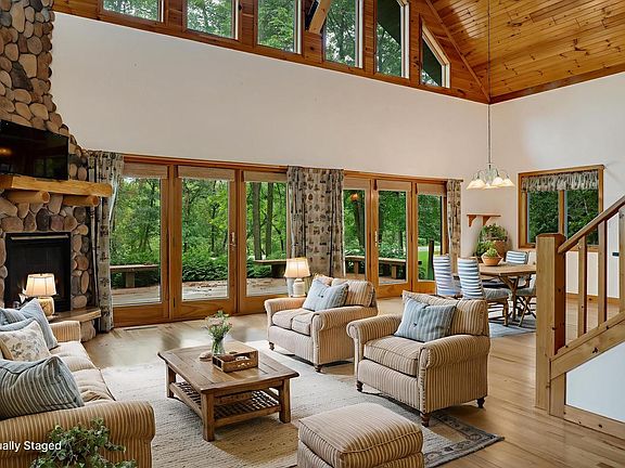Custom-waterfront homeFull stone fireplaceBreathtaking viewsVaulted ceilingsOpen-concept livingExpansive front deckVibrant perennial gardens