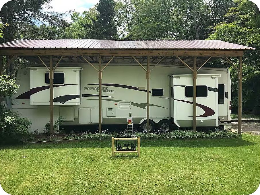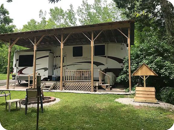 Unique opportunity to own a beautiful 36’ 5th wheel with a 20’ x 40’ roof structure built over it for year-round protection and comfort. This property features a spacious deck, two storage sheds, septic system, and electric service already in place.