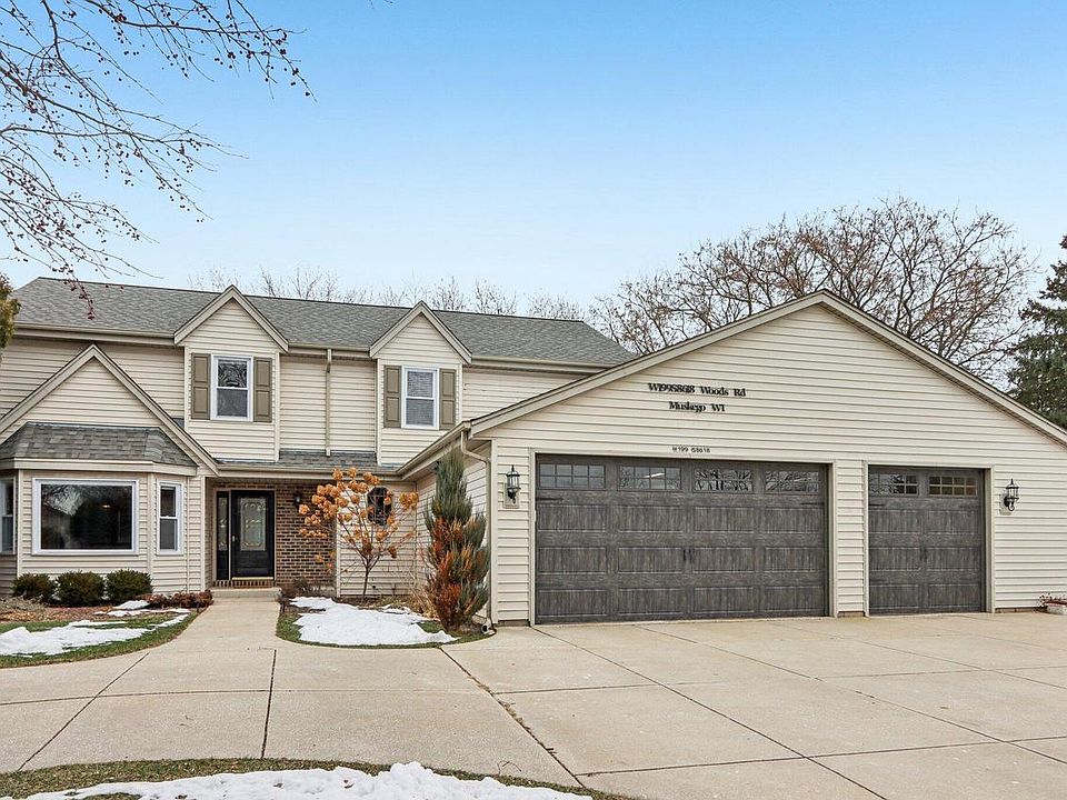 This inviting Muskego Colonial welcomes you with a circular drive & picturesque landscaping. Open-concept living makes entertaining easy. The sun-filled Great Room features a cozy gas fireplace, skylights and all-new windows that bring in abundant natural light. Adjoining dining room overlooks the backyard patio. The eat-in kitchen offers stainless appliances, quartz counters & a pantry. Relax in the Primary Suite with a spa-like bath and walk-in closet. The connected spacious three-season room is perfect for enjoying the backyard views. Upstairs includes two generous bedrooms, a flexible loft with potential for a 4th bedroom (newer carpet throughout). Oversized 3.5 car garage with hose & a large garden that is ready for spring. Recent updates: AC, water heater and all windows in 2024.