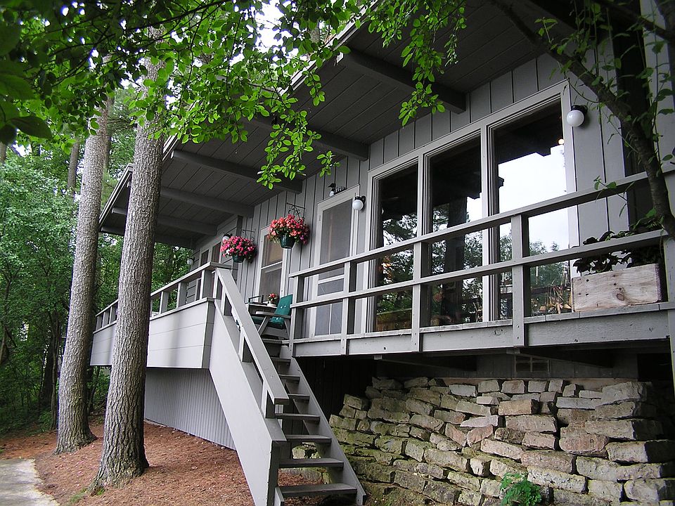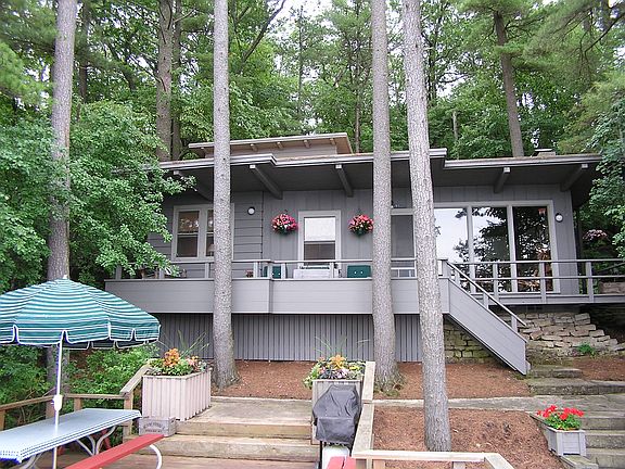 Listing Agent-Dan Bierman 920-294-3661 Exceptionally private waterfront cottage that is tucked away amidst stands of tall majestic white pines. Designed for casual living, the open floor plan has a marvelously appearing atmosphere and is enhanced with a wood beamed ceiling, wood floors and brick fireplace, giving you that "up north" feel, that you are looking for. The wall of glass in the dining area offers incredible views of the lake and gives the illusion that you are floating on the water. Don't tell the relatives about the delightful, private guest suite, with a large picture window that overlooks the lake, or you'll likely discover cousins you have never heard of. Lounge in the sun, relax in the shade, and view beautiful sunsets on one of the multiple outdoor living areas. There is a large patio on the boathouse roof at the water's edge, two other decks that cantilever over the water and a spacious wrap around deck that embraces the home. Slow down the tempo in your life and let the waves lull you to sleep, when you own this rare, private setting, waterfront property. The home is being sold furnished, so the only thing missing is YOU!