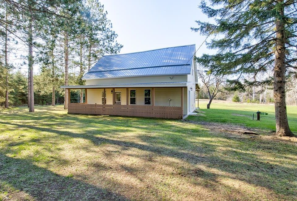 Marinette County country home, 3 bedrooms on peaceful dead-end road on almost 3 acres. New in 2023: Roof, siding, windows, flooring, paint, kitchen, bath, stairs, some plumbing, some electric. Two bedrooms on main floor and full bath. With hardwood flooring, LVT and main floor laundry. Upstairs features 1 massive room to be used at your discretion, along with another room for a closet or a den. Walk out the back door to a huge covered patio. Beautiful scenic lot surrounded by woods. Barn with power and settler's cabin (no power or water). Drilled well, conventional septic. This home has charm and character. Newer LP GFA heating system! Motivated seller!!