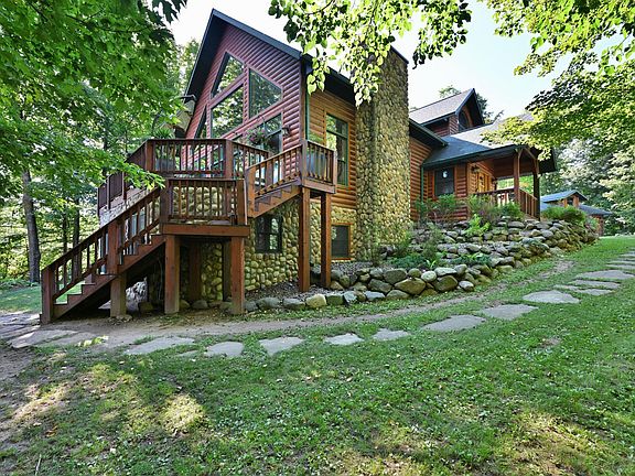 Soothing waterfallLower level family roomSweeping lake viewsHot tub roomPrivate northwoods retreatSoaring wood ceilingsInviting fireplaces