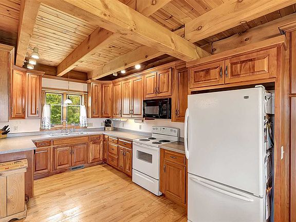 Solar Powered renovated Log Home on 3.2 acres w/pine lined cathedral ceilings, Energy King fireplace, wrap around porch, walk out basement, first floor laundry and nature on all sides. 3 bedrooms, 2.1 bath, 5 car and plenty of room for storage in the bonus rooms above both garages. 1 bedroom GUEST HOME with granite counters and heated floors, GARN wood boiler and a solar panel system that creates an average of $1000 annual income netted against heat and electric utilities are just a few extras with this home. Right up the hill from highway 29 and 20 minutes from Green Bay.