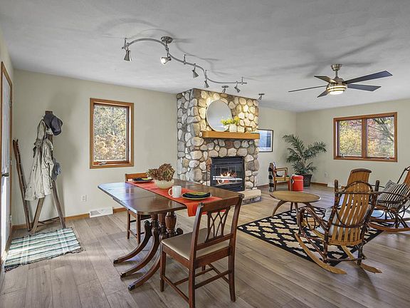 If you've been looking for a well-maintained home with land for hobbies/animals, look no further! This sunny 6 acre property features an oak forest, restored native prairie w/ trails, a small orchard and a vineyard- endless potential to make it your own! Step into this bright, charming energy-efficient home and let your stress melt away. The eat-in kitchen opens to the living space and fireplace for easy entertaining. Walkout bsmt with 2 beds,rec room and full bath offers loads of space to spread out. Grab a coffee & watch sunrises & sunsets from your south-facing deck. Upgrades include: new copper piping, solar panels (avg. $150/mth profit!)new flooring throughout, new insulation and siding, elec. car charger, underground/programmable irrigation systems for orchard and garden.