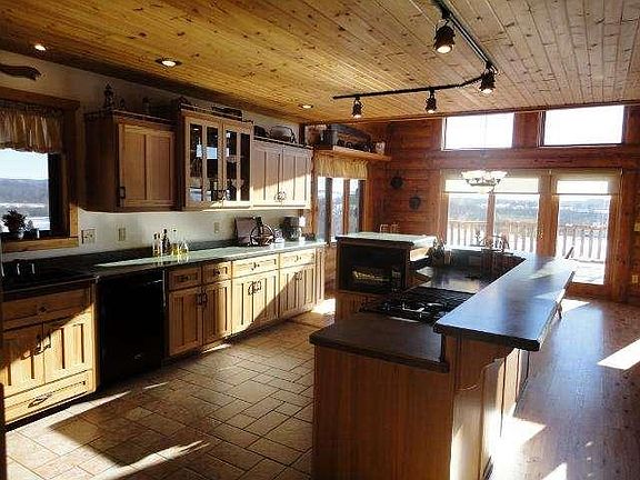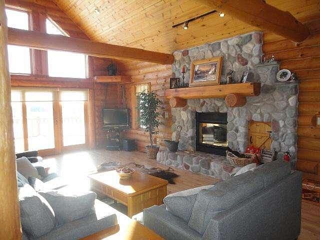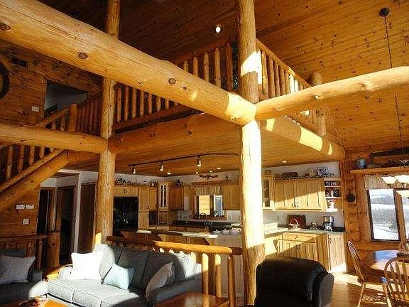 Handcrafted log home. Exciting private lodge northwoods feeling home on over 3 acres. Huge 56'x104' heated pole barn w/ office. Gourmet kitchen that flows into the great room w/ soaring ceilings & walls of windows & fireplace. 1st floor master bedroom suite. Exposed lower level family room and rec room w/ 2nd full kitchen. Beautifully landscape w/ outdoor stove, refrigerator & firepit. In floor heating throughout. Pole barn overhead doors are 20 ft. wide x 14 ft.tall