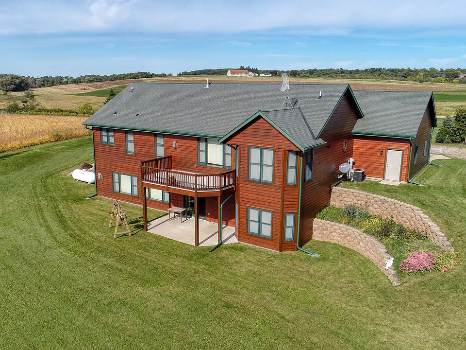 Admire the views for miles and miles from this beautiful hilltop setting! Newer ranch home features an open concept design, main floor laundry, finished walk-out LL with a wet bar & gas fireplace, & spacious, insulated garage with stairs into the basement and root cellar. The property also has a Cleary pole barn 45'x72' with a concrete floor, electric, overhead doors, and wood burning stove. Approximately 46 acres of land are tillable which is currently subject to a 1 year lease. Newly stained exterior!