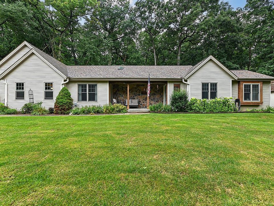 Welcome to your private wooded oasis tucked away on a private road! An abundance of nature 2 sides back up to a natural corridor. This spacious split bedroom ranch features a bright open layout w/vaulted ceilings, stone gas fireplace, Kitchen granite tops, warm hickory HWF's & an island. The serene main suite opens to a stamped concrete patio & scenic backyard. Newer Anderson windows & patio doors ensure natural light fills the home. Main floor laundry. The LL is plumbed for a bath. The spacious 2.5 car garage is insulated & drywalled. Outdoors, features landscaped flowerbeds, patios, parking slabs & 12x16 shed w/2 lofts .Upgrades include a 2017 roof, skylight, gutters & down spouts, radon system, Andersen windows & Patio door 2022, Furnace & A/C 2022. Peace, privacy, & charm