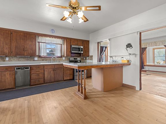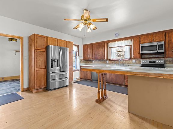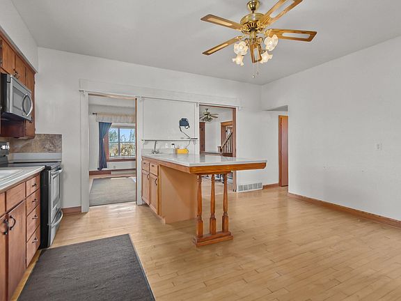 Enjoy space and character in this unique multi-level property on 4+ acres. The main level features an updated kitchen, a welcoming living room with an open staircase, a den, a bedroom, a full bath, a convenient laundry room, and an enclosed front porch. Upstairs offers three additional bedrooms, a 15x12 second kitchen, and another full bath, while the third floor provides a 34×21 partially-finished room plus a 27×9 attic area. Hardwood floors run throughout, and the upper-level windows have been updated. Outside, you'll find a 38×75 barn, a 25×80 partially heated workshop with five stalls and a concrete floor, and a granary with electrical. There is a pond, fruit trees, and an established asparagus plant. All furnishings and personal property included. Sold as is.