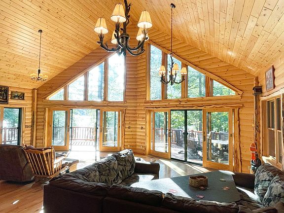 Lake Alice Private Peninsula Home. One-of-a-kind 2.87 acres with 1380 ft of frontage on a quiet fishing bay of Lake Alice. Launch your boat right near the property. Home features 1/2 log siding, cathedral ceilings, and beautiful live edge trim throughout. Spacious kitchen includes a large breakfast bar, and the main level features a bedroom and full bath. Multiple double patio doors lead to a large lakeside deck with level frontage. The upper level boasts a large loft bedroom, while the lower level has a partially finished office that can be converted into a bedroom with an egress window. The lower level also includes a large rec room with patio doors leading to the landscaped yard and fire pit area. The bathroom is prepped for a sink and shower, with the toilet already installed. The property includes two docks, with an affidavit allowing the potential to clear up to 200 ft of frontage is desired.