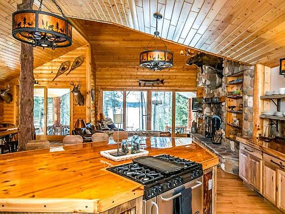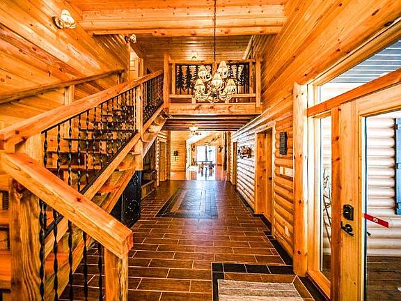 Expedition Northwoods lodge. 1/2 log no maintenance siding. You will feel like you are in mountain lodge from this large entrance to full wall stone open fireplace. Log accents in the interior with just the right amount of drywall. Full Log in the center of the great room, wood ceilings and wood floors. Open log burning fireplace will keep you warm as you look out the over sized patio doors to the lake front. Large lake side cover deck. Huge kitchen area with Hickory cabinets, Northwoods accent pulls and light fixtures, commercial gas stove. Large master suite with walk in closet, master bath with walk-in shower, custom cabinets, molded sinks and deep soaking tub. Large loft area is with 2 bed and each having a private bath. Large office area off kitchen could be a guest bedroom. Almost everything in this house was custom made! 37x37 attached 4 car garage and loft area for storage or finish it off as a bonus room. Private 152 ft of frontage.