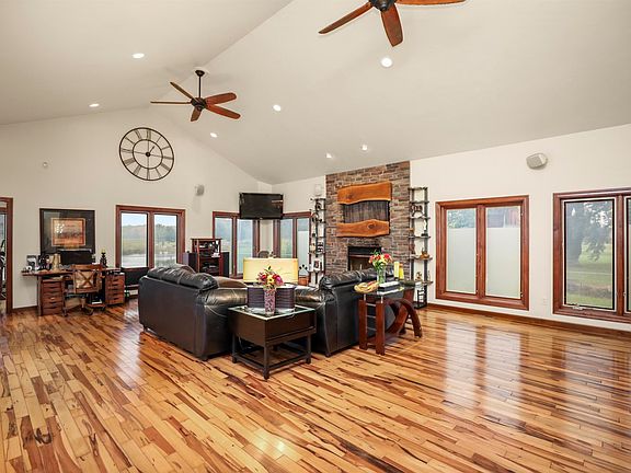 Impressive home remodeled extensively in 2008 boasts over 5700+/- sq ft. Step inside to a huge living room with wood burning FP, cathedral ceilings open to the gourmet kitchen. Kitchen offers high appliances, island, dining area w/ wet bar. Master suite features private bath w/ walk-in tile shower, jetted tub & dual vanities. Adjoining fitness room w/ hot tub. 4 additional bedrooms, 3 full baths, upper bonus room, laundry and family room with gas FP. Unique center courtyard with fountain area. Attached 3 car garage, separate 80x30 barn and private pond situated on 4.95 +/- acres.