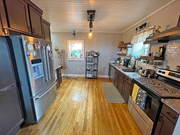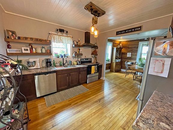 L-8191: Inviting 3 bed, 2 bath home blends timeless character with modern convenience. Inside, you'll find carefully preserved solid hemlock log walls throughout, giving the home a warm, rustic feel. The spacious kitchen features stainless steel appliances, open shelving, and rich wood cabinetry, while the adjoining dining room is filled with natural light - the perfect gathering space. Beautiful wood floors flow throughout, tying it all together. A convenient bath/laundry combo offers updated finishes and modern appliances. Second floor features a spacious full bath and 3 bedrooms. Peace of mind comes built in with major upgrades completed in 2024-2025, including all new windows, siding, roof, plumbing, electrical, drilled well, septic system, concrete work, and MORE! Move-in ready and full of character, this home combines the best of country charm and worry-free modern living.