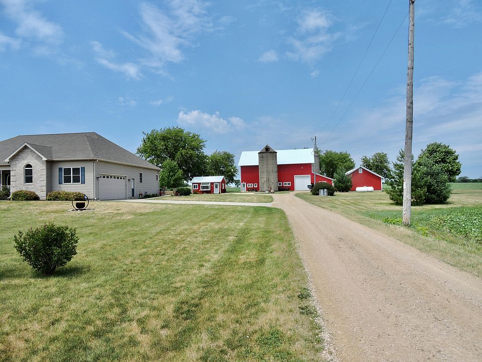 Beautiful farmette on 6.3 acres near WI/II border! Ranch home features open floor plan, Separate 24 x 53 heated shop, 41 x77 barn, 15 x 22 garden shed!Home features 9'ceilings, 2x6 exterior walls, 6 panel hardwood doors, wood windows with removable grills-Breakfast bar in kitchen with 36''and 42'' Alder cabinets-Great room with stone wood burning fireplace, and cathedral ceiling-Master bedroom has tray ceiling, master bath has heated tile floor with walk in shower and whirlpool tub-Laundry room with utility sink, full size refrigerator,freezer, washer,dryer Tongue and grove cedar 3 season porch with cathedral ceiling - Basement has garage and in house access, 2 egress windows-Oversized garage door 18 x 18 - Central vac system, ADT Security System and Security Cameras.
